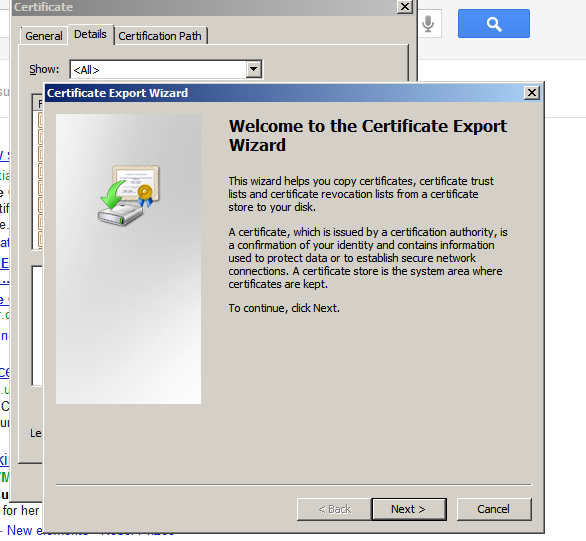 4. Click on the Details tab and click copy to file you see the following screen. Click next.